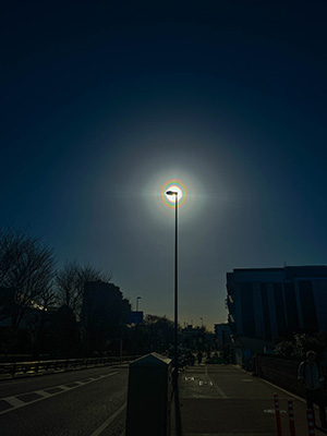 2023年2月28日(火) 花粉が作る「にじ」!? 日本列島が高気圧におおわれ、温かい空気が南から流れ込み一気に気温が上がったこの日は春がやってきたことを実感させる一日となりましたが、同時にスギ花粉も飛び始めたようです。今年は例年よりかなり花粉の量が多いとの予想通り、太陽を見上げると空気中の花粉の粒子(りゅうし=小さいつぶ)によって太陽のまわりに虹(にじ)のような光の輪(花粉光環=かふんこんかん)を見ることができました。花粉症の人にはつらい季節の始まりでもありますね~ ★太陽を直接見ると目をいためます。写真のように電信柱、建物などで太陽自体をさえぎった形で観察しましょう。 (28日・上石神井にて) (画像と情報:スタッフのつとむさん) | |