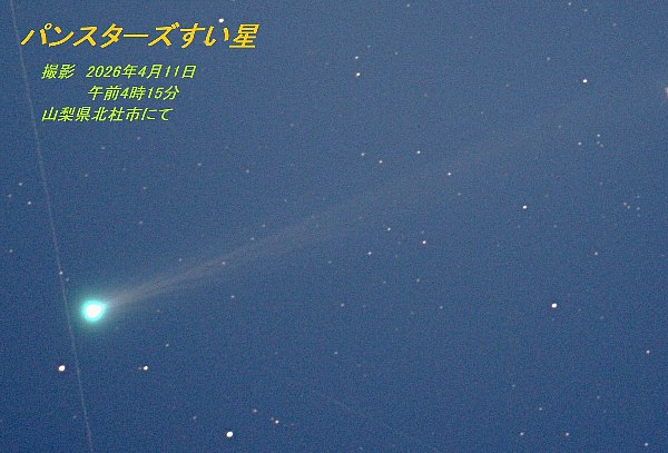 2023年8月23日(水) 西村新すい星、東京から見えるかな? 伝統的たなばたの日、おりひめ、ひこぼしは見えましたか?雨がとぎれたほんのひとときの晴れ間に、見えていましたよ。 さて、新すい星が見つかりました。日本人発見によるものです。静岡県の西村さんが12日の未明、ふたご座ふきんで新しい天体を見つけました。その後世界各地で確認の観測が行われ、西村すい星(C/2023P1Nishimura)と名付けられました。明け方の東の空 に見えています。9月中ごろに太陽に近づき、2等級ほどの明るさになると予報されています。でも実さいには地平高度が低く、見ることができるのは10日くらいまでといわれています。明け方4時半ごろ、近くにある金星を目じるしにして双眼鏡でさがすと見つかるかもしれません。 西村すい星画像(→クリック) (情報:スタッフのコタジー) |